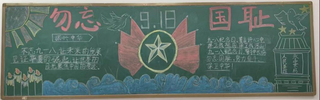 其次开展一次黑板报评选,激发同学们的爱校、荣校的责任感,展现校园文化风采,彰显员工个性,各班级团支部组织参加“勿忘国耻 砥砺前行”——纪念“九一八事变””主题团日黑板报评选。